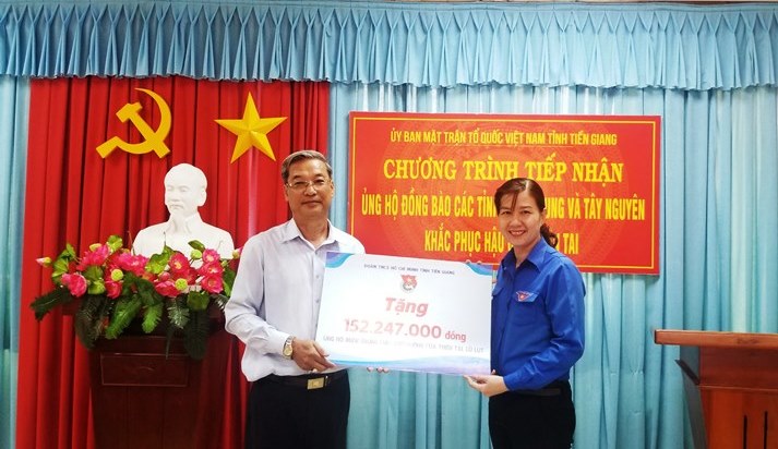 ĐTN: Ngày 11/01, Ban Thường vụ Tỉnh Đoàn, Ban Thư ký Ủy ban Hội LHTN Việt Nam tỉnh Tiền Giang thay mặt cho toàn thể Đoàn viên, Hội viên, thanh niên tỉnh nhà trao kinh phí hỗ trợ đồng bào miền Trung khắc phục thiên tai đóng góp về Ủy ban Mặt trận Tổ quốc Việt Nam tỉnh Tiền Giang, trị giá 172.247.000 đồng.
