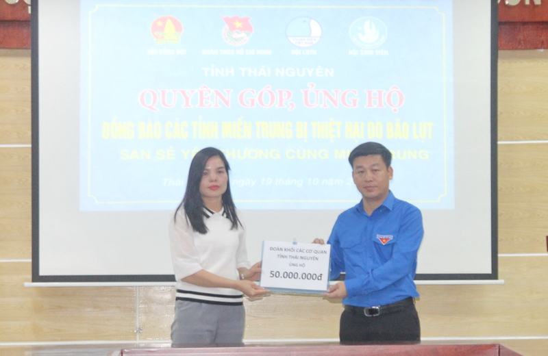 Web.ĐTN: Ngày 19/10, Đoàn TNCS Hồ Chí Minh, Hội LHTN, Hội Sinh viên, Hội đồng Đội tỉnh Thái nguyên tổ chức Chương trình Tiếp nhận ủng hộ đồng bào các tỉnh Miền Trung bị thiệt hại do bão lụt, thiên tai.
