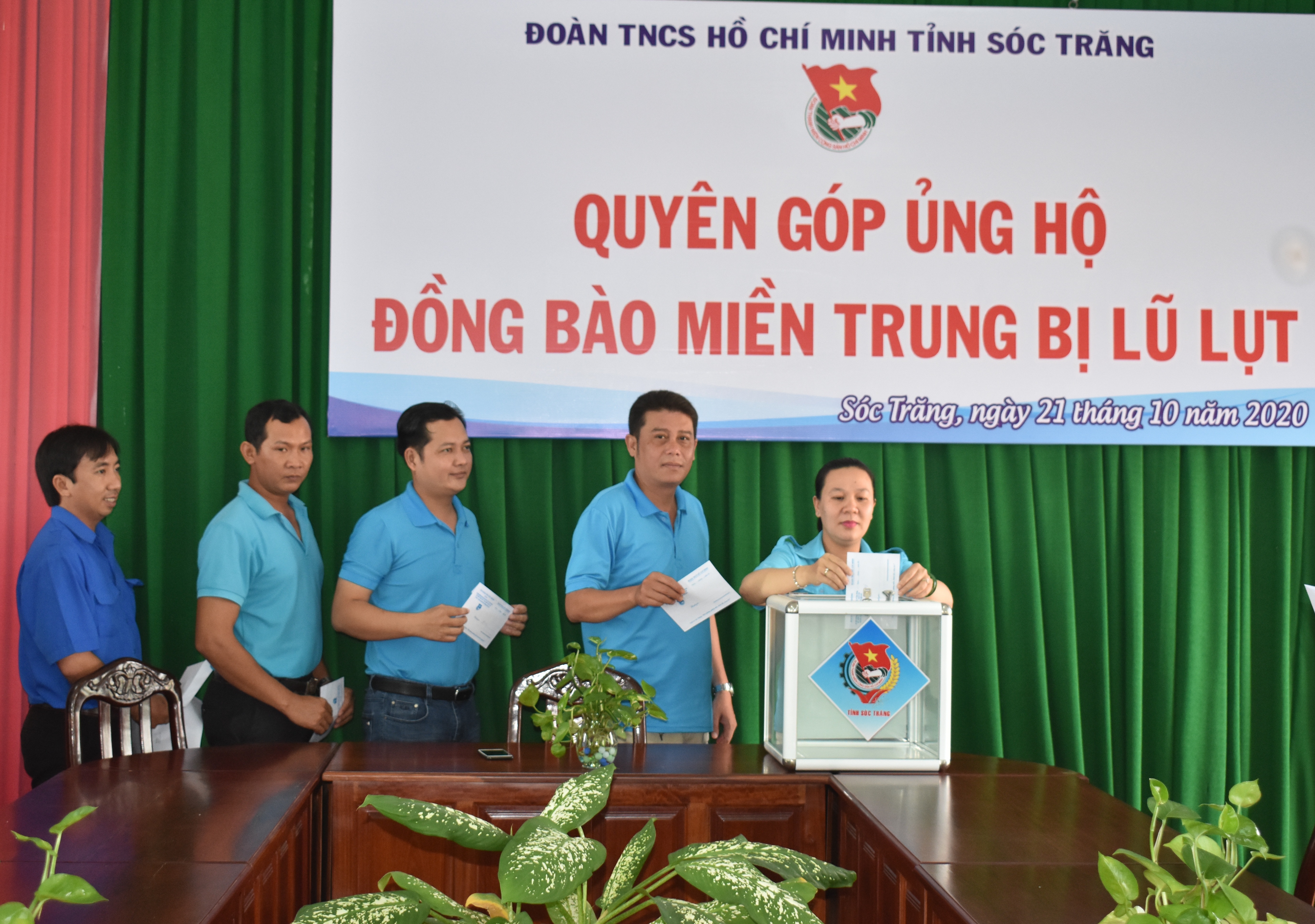 Web.ĐTN: Sáng 21/10, Tỉnh đoàn Sóc Trăng tổ chức cho cán bộ, công chức cơ quan Tỉnh đoàn quyên góp ủng hộ đồng bào miền Trung bị lũ lụt. Ngay sau phát động, cán bộ, công chức cơ quan Tỉnh đoàn đã ủng hộ mỗi người ít nhất một ngày lương, được số tiền 27.423.486 đồng.