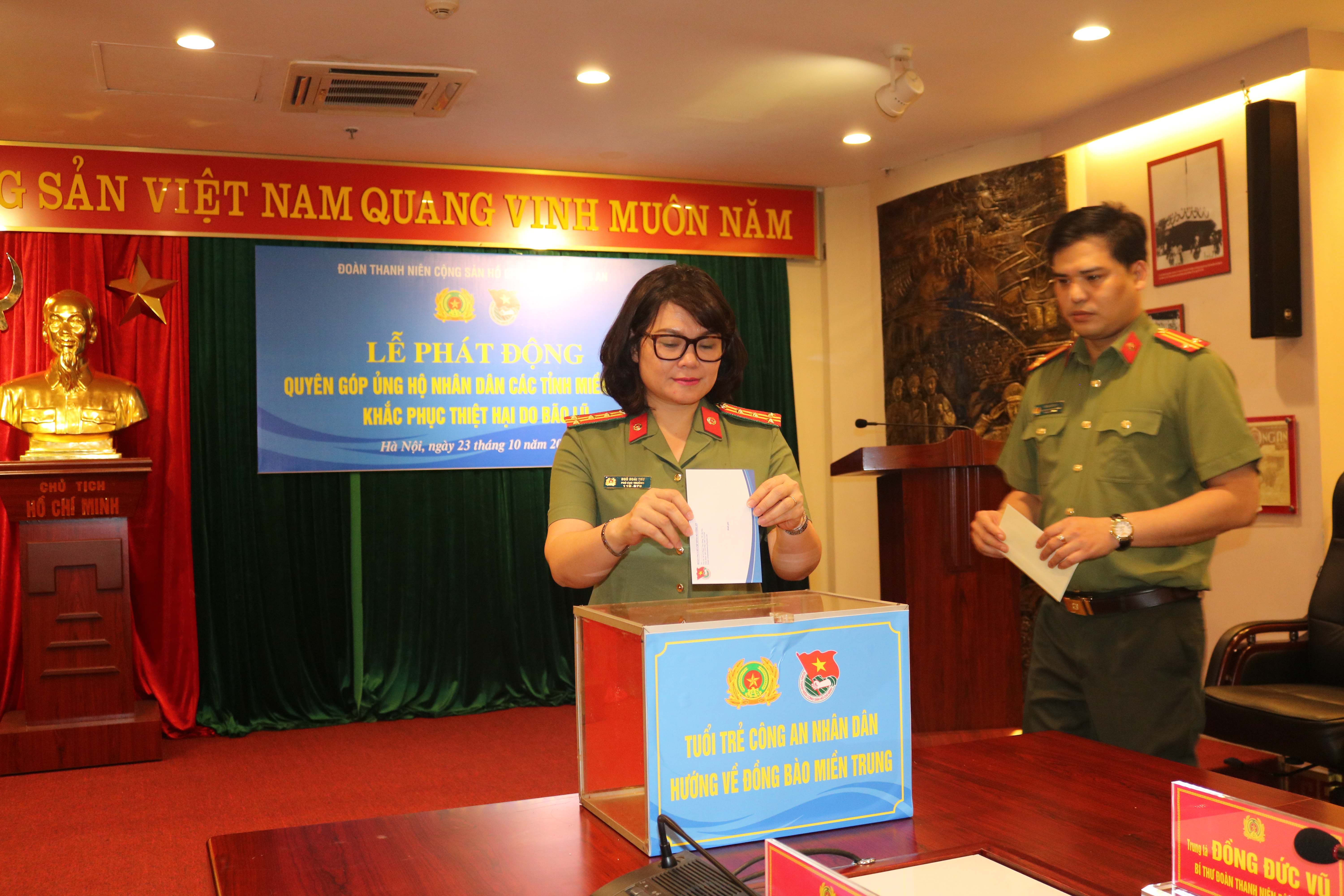 Web.ĐTN: Hưởng ứng lời kêu gọi của Tổng Bí thư, Chủ tịch nước Nguyễn Phú Trọng; Thủ tướng Chính phủ Nguyễn Xuân Phúc, chiều 23/10, Ban Thường vụ Đoàn Thanh niên Bộ Công an tổ chức Lễ phát động quyên góp và tiếp nhận các nguồn lực ủng hộ nhân dân các tỉnh miền Trung khắc phục hậu quả thiên tai, bão lũ.
