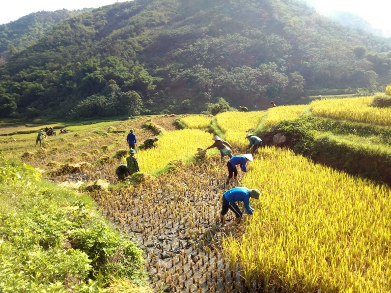 Thanh niên đội nắng giúp bà con vùng cao gặt lúa