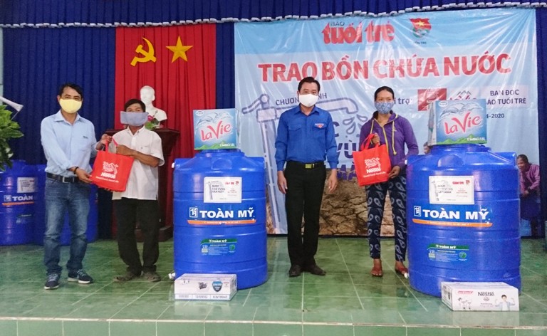 Web.ĐTN: Ngày 6/4, báo Tuổi Trẻ phối hợp với Tỉnh đoàn Bến Tre, Tiền Giang trao tặng bồn chứa nước và nhu yếu phầm cho các hộ có hoàn cảnh khó khăn tại vùng hạn mặn.