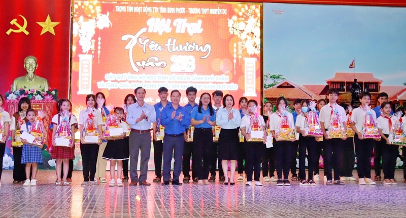 ĐTN: Tối ngày 07/01, Trung tâm hoạt động thanh thiếu nhi tỉnh Bình Phước cùng Trường THPT Nguyễn Du (TP. Đồng Xoài) phối hợp tổ chức chương trình nghệ thuật Đêm hội “Xuân yêu thương” và trao quà cho thanh thiếu nhi có hoàn cảnh khó khăn nhân dịp Tết Quý Mão năm 2023 với nhiều hoạt động ý nghĩa.