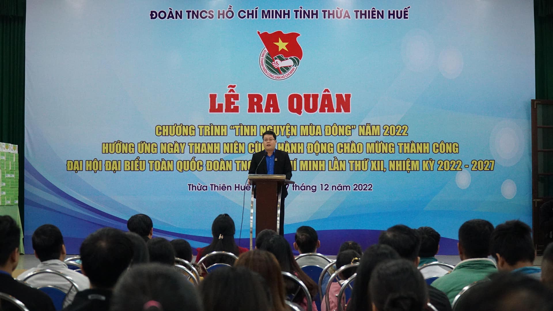 ĐTN: Sáng 17/12, Ban Thường vụ Tỉnh Đoàn đã tổ chức Lễ ra quân chương trình “Tình nguyện mùa Đông” năm 2022 hưởng ứng ngày thanh niên cùng hành động chào mừng thành công Đại hội Đại biểu toàn quốc Đoàn TNCS Hồ Chí Minh lần thứ XII, nhiệm kỳ 2022 - 2027 tại UBND phường Phú Bài (thị xã Hương Thủy).