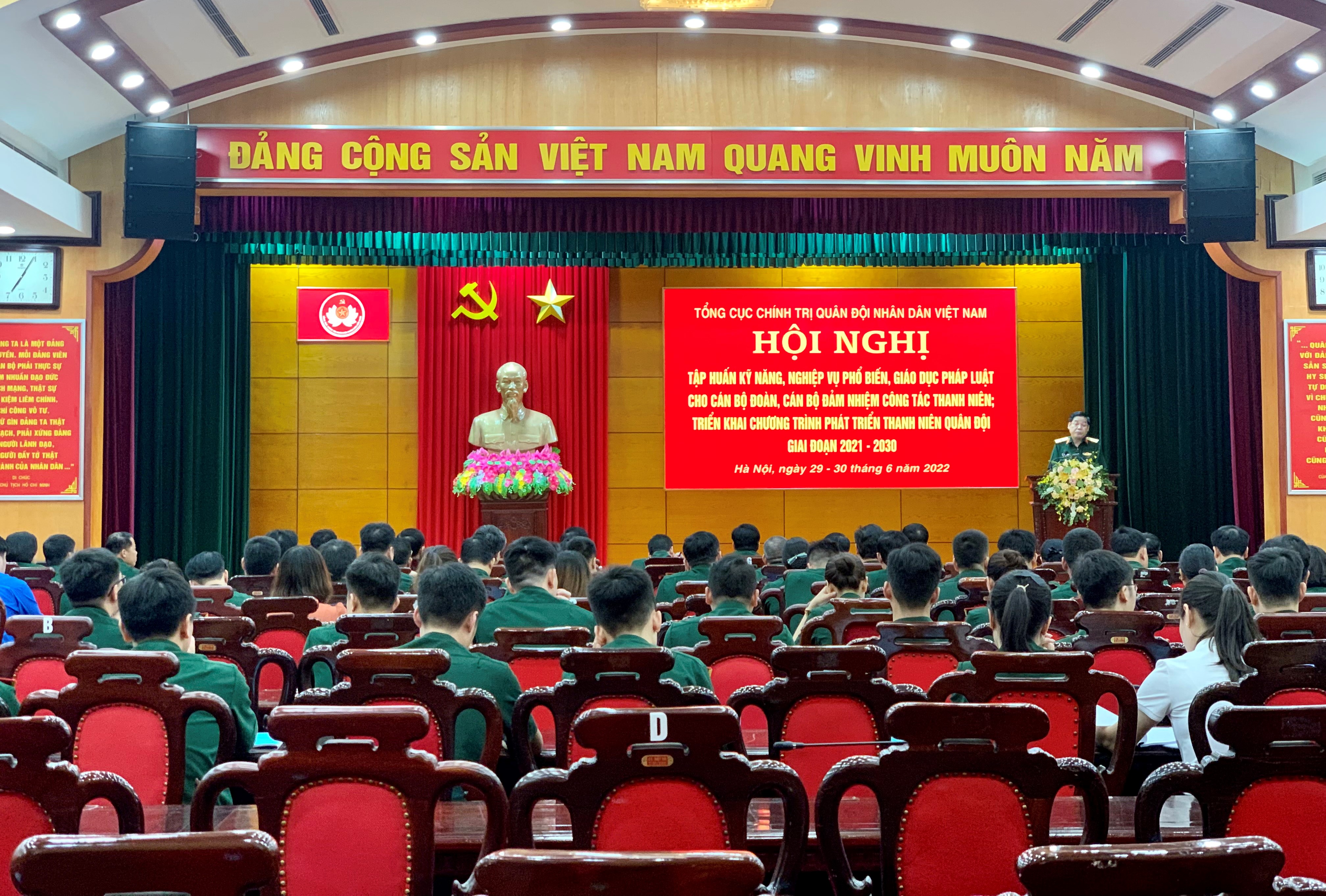 ĐTN: Sáng 29/6, Tổng cục Chính trị (TCCT) Quân đội nhân dân Việt Nam tổ chức tập huấn kỹ năng, nghiệp vụ, phổ biến giáo dục pháp luật (PBGDPL) và triển khai Chương trình phát triển thanh niên Quân đội giai đoạn 2021- 2030 cho cán bộ đoàn, cán bộ đảm nhiệm công tác thanh niên toàn quân từ ngày 29/6- 30/6/2022.