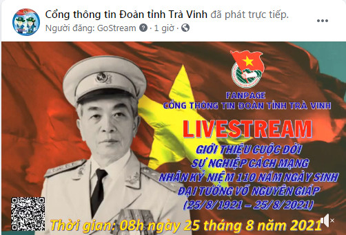 ĐTN: Sáng 25/8, Tỉnh đoàn Trà Vinh tổ chức triển lãm online giới thiệu về cuộc đời và sự nghiệp của Đại tướng Võ Nguyên Giáp. Hoạt động triển lãm được livestream trên Fanpage Cổng thông tin Đoàn tỉnh Trà Vinh.