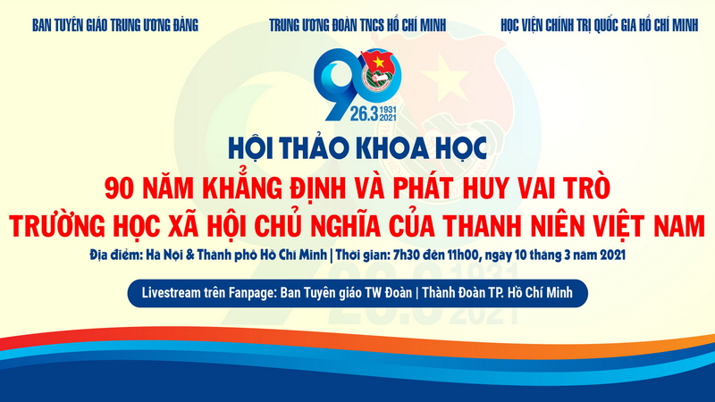 ĐTN: Nhân kỷ niệm 90 năm Ngày thành lập Đoàn TNCS Hồ Chí Minh, Trung ương Đoàn TNCS Hồ Chí Minh, Ban Tuyên giáo Trung ương, Học viện Chính trị Quốc gia Hồ Chí Minh tổ chức Hội thảo khoa học “90 năm khẳng định và phát huy vai trò trường học xã hội chủ nghĩa của thanh niên Việt Nam” vào sáng 10/3/2021.