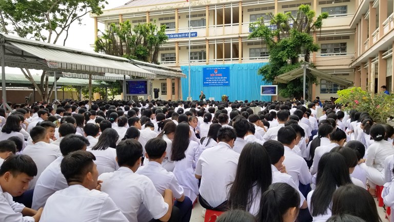 Web.ĐTN: Ngày 02/10/2020, Ban Thường vụ Tỉnh Đoàn Tiền Giang tổ chức Hội nghị tuyên truyền tình hình Biển Đông và công tác bảo vệ chủ quyền, an ninh biên giới biển, đảo của Tổ quốc cho gần 300 đoàn viên thanh niên, học sinh tại trường THPT Gò Công, thị xã Gò Công.