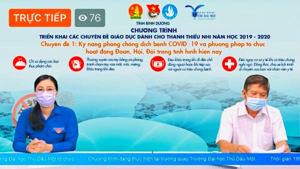 Web.ĐTN: Tối 8/4, Tỉnh Đoàn, Hội LHTN, Hội Sinh viên, Hội đồng Đội tỉnh Bình Dương phối hợp cùng trường Đại học Thủ Dầu Một tổ chức Chương trình livestream trực tuyến triển khai chuyên đề “Kỹ năng phòng, chống dịch bệnh và phương pháp tổ chức hoạt động Đoàn, Hội, Đội trong tình hình hiện nay”.