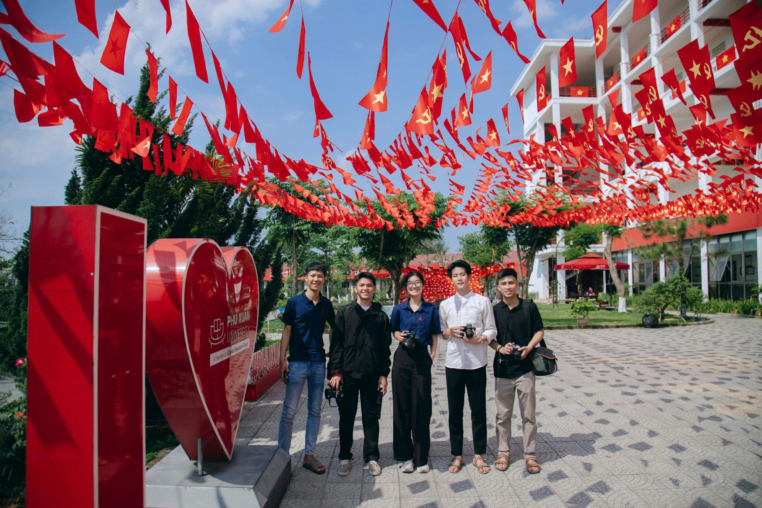 ĐTN: Trong không khí tưng bừng lễ 30/4 - 1/5, Trường ĐH Phú Xuân (TP.Huế) đã khoác lên mình chiếc áo đỏ rực rỡ của cờ Tổ quốc và cờ Đảng, thu hút đông đảo bạn trẻ đến 'check-in' và lan tỏa tinh thần yêu nước.