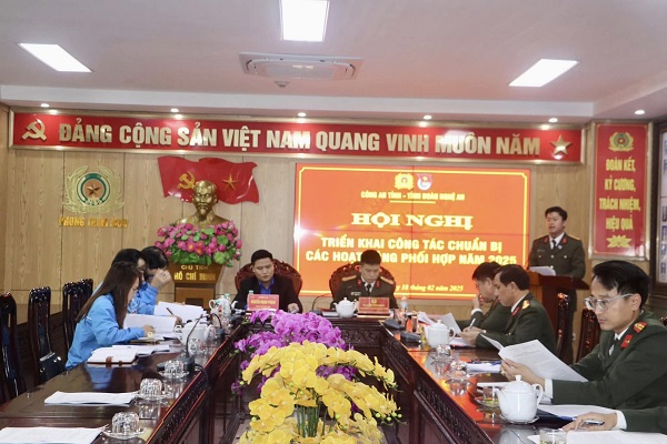 ĐTN: Chiều ngày 18/02/2025, Tỉnh đoàn - Công an tỉnh Nghệ An đã tổ chức Hội nghị triển khai công tác chuẩn bị các hoạt động phối hợp năm 2025, trọng tâm là các hoạt động kỷ niệm 80 năm Ngày truyền thống Công an nhân dân (CAND) Việt Nam và 20 năm Ngày hội toàn dân bảo vệ An ninh Tổ quốc (ANTQ).