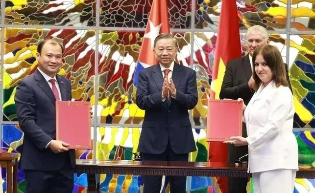 Tối 26/9, giờ địa phương, Tổng Bí thư, Chủ tịch nước Tô Lâm và Bí thư thứ nhất Đảng Cộng sản Cuba, Chủ tịch Cuba Miguel Diaz Canel Bermudez chứng kiến Lễ ký kết các văn kiện hợp tác giữa hai nước.