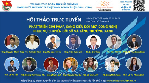 ĐTN: Ngày 23/10, Mạng lưới trí thức trẻ Việt Nam toàn cầu đã tổ chức hội thảo trực tuyến về “Phát triển giải pháp, sáng kiến đổi mới công nghệ phục vụ chuyển đổi số và tăng trưởng xanh” trong chuỗi sự kiện hướng đến Diễn đàn Trí thức trẻ Việt Nam toàn cầu lần thứ 4 năm 2021 do Trung ương Đoàn TNCS Hồ Chí Minh tổ chức.