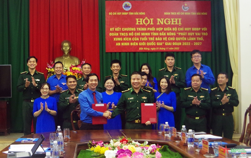 ĐTN: Ngày 01/11/2022, diễn ra Hội nghị ký kết chương trình phối hợp giữa Bộ Chỉ huy Bộ đội Biên phòng tỉnh với Đoàn TNCS Hồ Chí Minh tỉnh Đắk Nông giai đoạn 2022 - 2027 với chủ đề “Phát huy vai trò xung kích của tuổi trẻ bảo vệ chủ quyền lãnh thổ, an ninh biên giới quốc gia”.