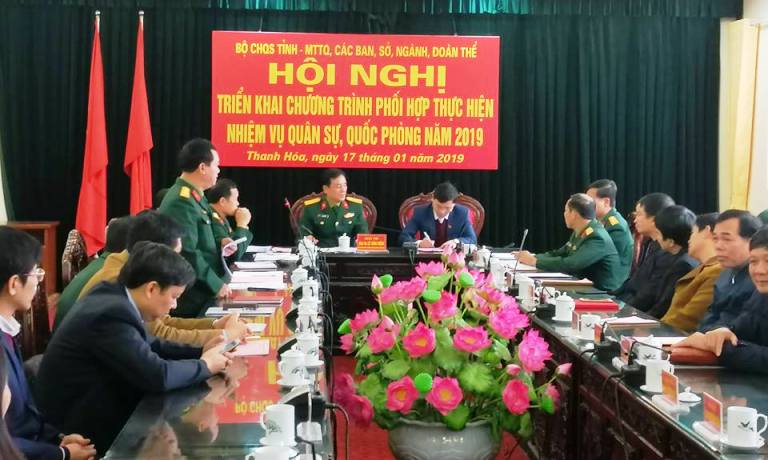 Web.ĐTN: Sáng ngày 17/01, Bộ Chỉ huy quân sự tỉnh, Mặt trận Tổ quốc, các Sở Ban ngành, Tỉnh đoàn và các tổ chức đoàn thể tỉnh Thanh Hóa phối hợp tổ chức Hội nghị triển khai thực hiện nhiệm vụ quân sự quốc phòng năm 2019.