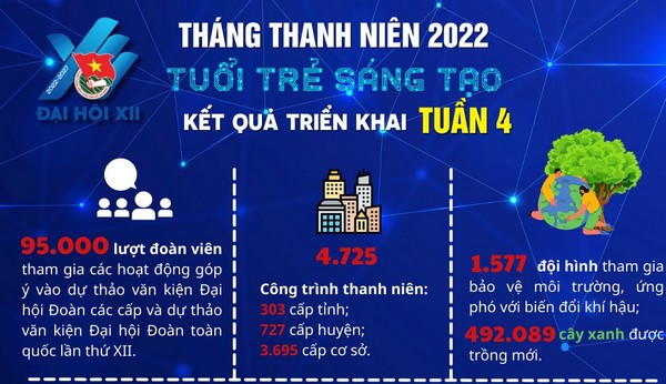 ĐTN: Trong tuần 04, các cấp bộ Đoàn đã triển khai thực hiện 4.725 công trình thanh niên các cấp (303 công trình thanh niên cấp tỉnh, 727 công trình thanh niên cấp huyện). Các tỉnh, thành đoàn đã thành lập 1.577 đội hình tham gia bảo vệ môi trường, ứng phó với biến đổi khí hậu với gần 25.000 lượt đoàn viên, thanh niên tham gia.