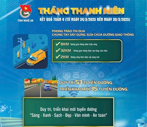 ĐTN: Trong chặng thi đua cuối cùng của Tháng Thanh niên năm 2025, tuổi trẻ Nghệ An đã triển khai nhiều hoạt động ý nghĩa, thiết thực chào mừng kỷ niệm 94 năm thành lập Đoàn TNCS Hồ Chí Minh (26/3/1931 - 26/3/2025). Các chương trình, công trình thanh niên không chỉ thể hiện tinh thần xung kích, sáng tạo mà còn góp phần giải quyết những nhu cầu thực tiễn của địa phương.