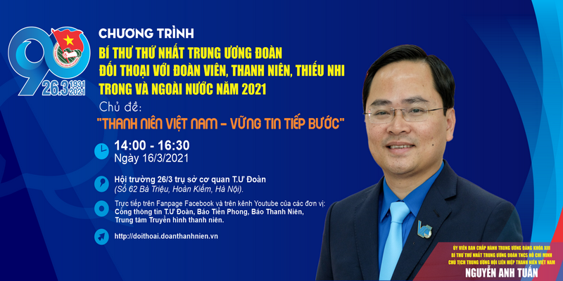 ĐTN: Chiều ngày 16/3/2021, sẽ diễn ra buổi đối thoại trực tuyến giữa đồng chí Nguyễn Anh Tuấn - Ủy viên T.Ư Đảng, Bí thư thứ nhất T.Ư Đoàn, Chủ tịch Hội LHTN Việt Nam với đoàn viên, thanh thiếu nhi trong và ngoài nước với chủ đề “Thanh niên Việt Nam - Vững tin tiếp bước”.