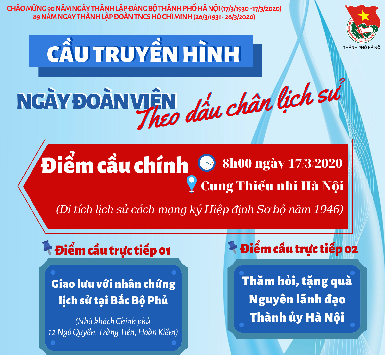Web.ĐTN: Sáng 17/3, Thành đoàn Hà Nội sẽ tổ chức chương trình Cầu truyền hình "Ngày đoàn viên - Theo dấu chân lịch sử" chào mừng 90 năm Ngày thành lập Đảng bộ thành phố Hà Nội (17/3/1930 - 17/3/2020), 89 năm Ngày thành lập Đoàn TNCS Hồ Chí Minh (26/3/1931 - 26/3/2020).