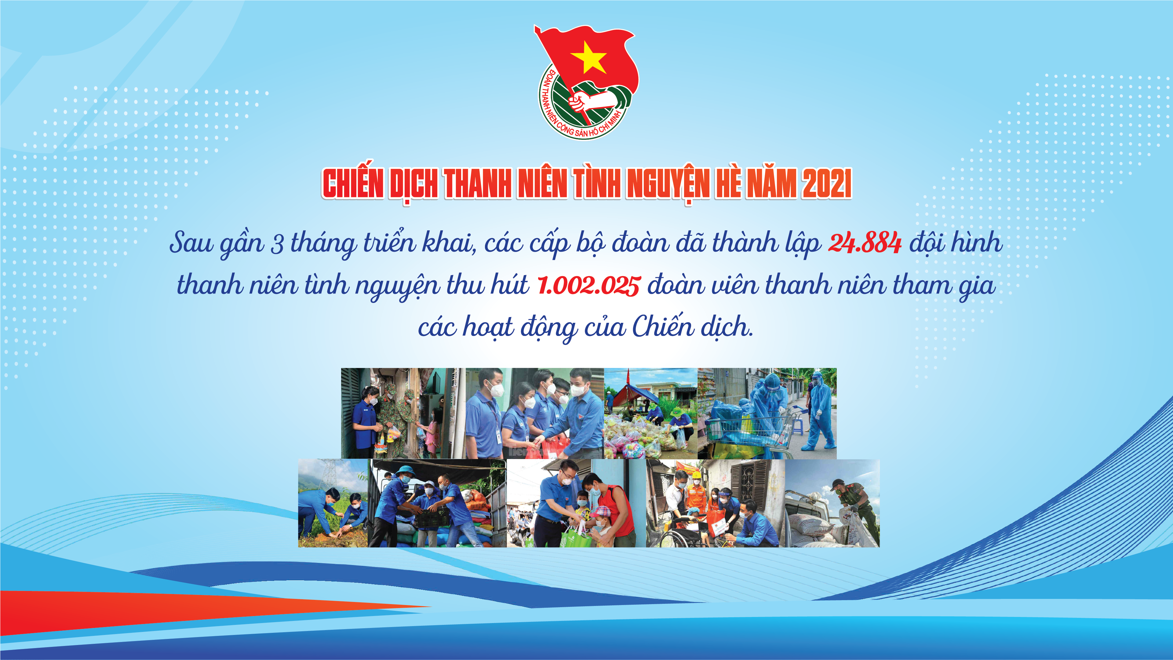 ĐTN: Sau gần 3 tháng triển khai, các cấp bộ đoàn đã thành lập 24.884 đội hình thanh niên tình nguyện thu hút 1.002.025 đoàn viên thanh niên tham gia các hoạt động của Chiến dịch Thanh niên Tình nguyện hè năm 2021.