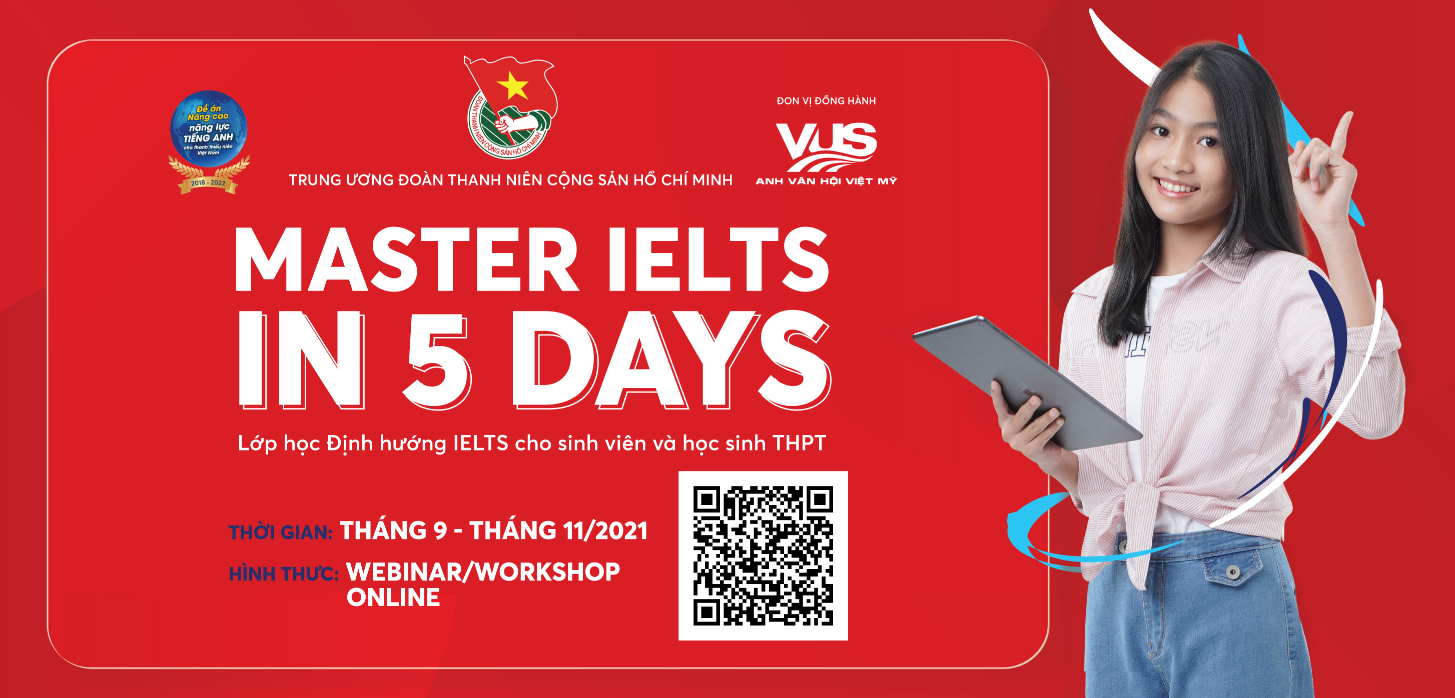 ĐTN: Chương trình “Master IELTS in 5 days” dành cho học sinh THPT và sinh viên đại học, cao đẳng trên cả nước, với số lượng tối đa 10.000 học viên, diễn ra từ đầu tháng 10 đến hết tháng 11/2021.
