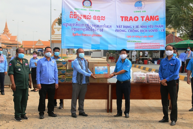 Web.ĐTN: Sáng 24/4, Tỉnh đoàn - Ủy ban Hội LHTN Việt Nam tỉnh Long An đã trao tặng vật tư y tế và các nhu yếu phẩm hỗ trợ công tác phòng chống dịch Covid-19 cho Liên đoàn Thanh niên Campuchia tỉnh Svay-Rieng và Prey-Veng tại Cửa khẩu quốc tế Bình Hiệp.