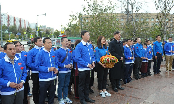 Đoàn đại biểu thanh niên Việt Nam dâng hoa tại tượng đài Bác Hồ ở Matxcova