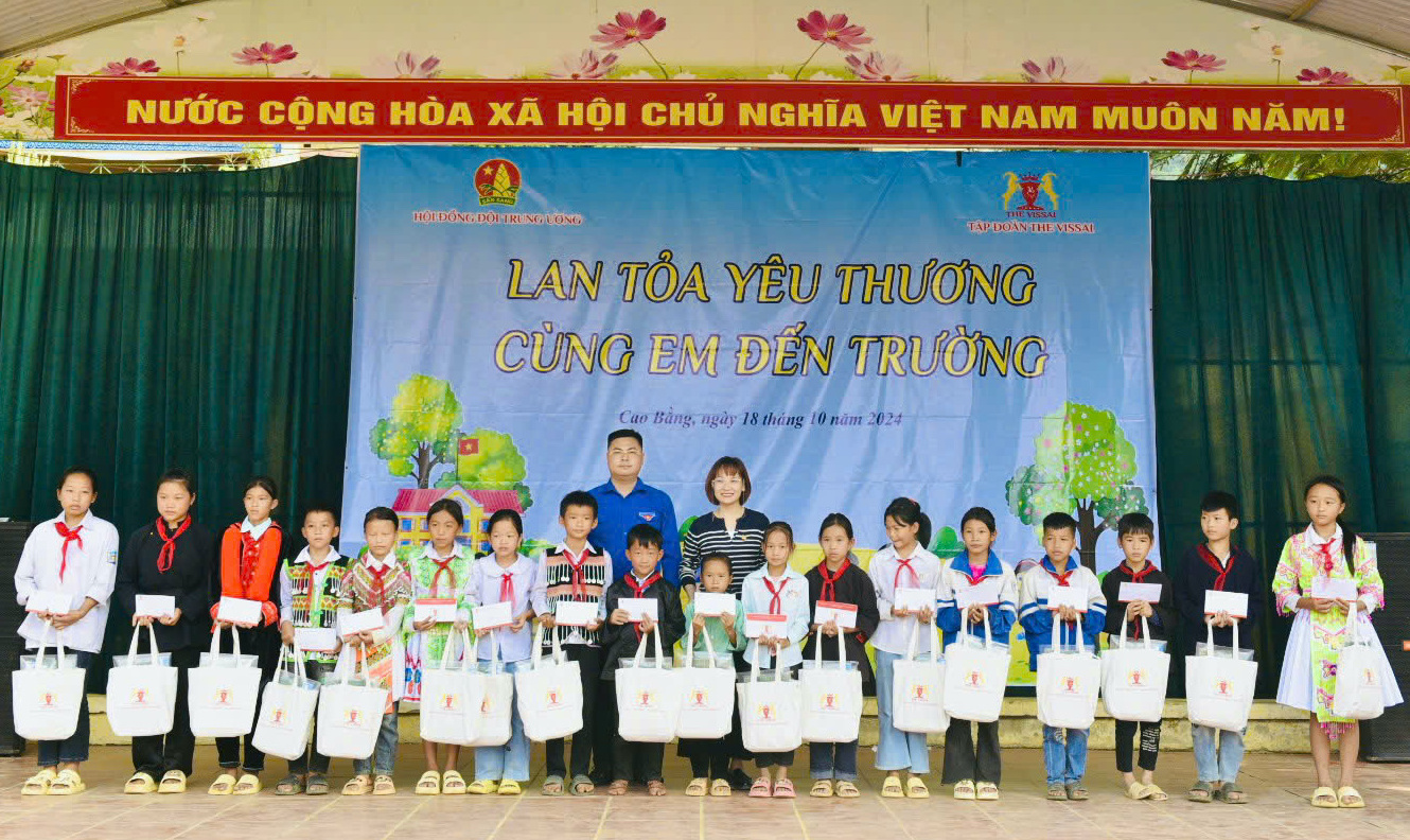ĐTN: Sáng ngày 18/10/2024 tại Trường Tiểu học Mai Long (tỉnh Cao Bằng), Hội đồng Đội Trung ương, Trung tâm Hỗ trợ và Phát triển thiếu nhi Việt Nam phối hợp với Tập đoàn The Vissai tổ chức chương trình “Lan tỏa yêu thương - Cùng em đến trường