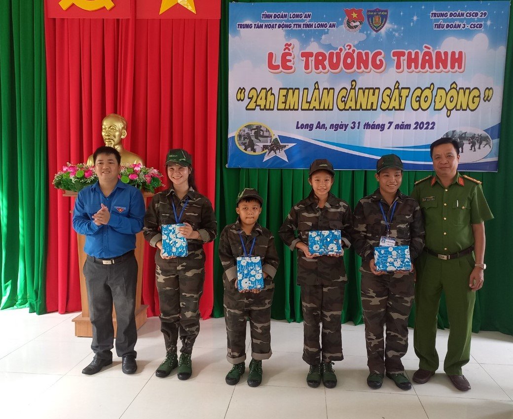 ĐTN: Sau 2 ngày (30 và 31/7) diễn ra Trương trình “24h em làm cảnh sát cơ động” tại Tiểu đoàn CSCĐ số 3 (xã Mỹ An, huyện Thủ Thừa) với nhiều hoạt động ý nghĩa, thiết thực. Ngày 31/7, Trung tâm HĐ TTN tỉnh Long An tổ chức tổng kết lớp “24h em làm cảnh sát cơ động” khóa I năm 2022, tại hội trường Tiểu đoàn CSCĐ 3.