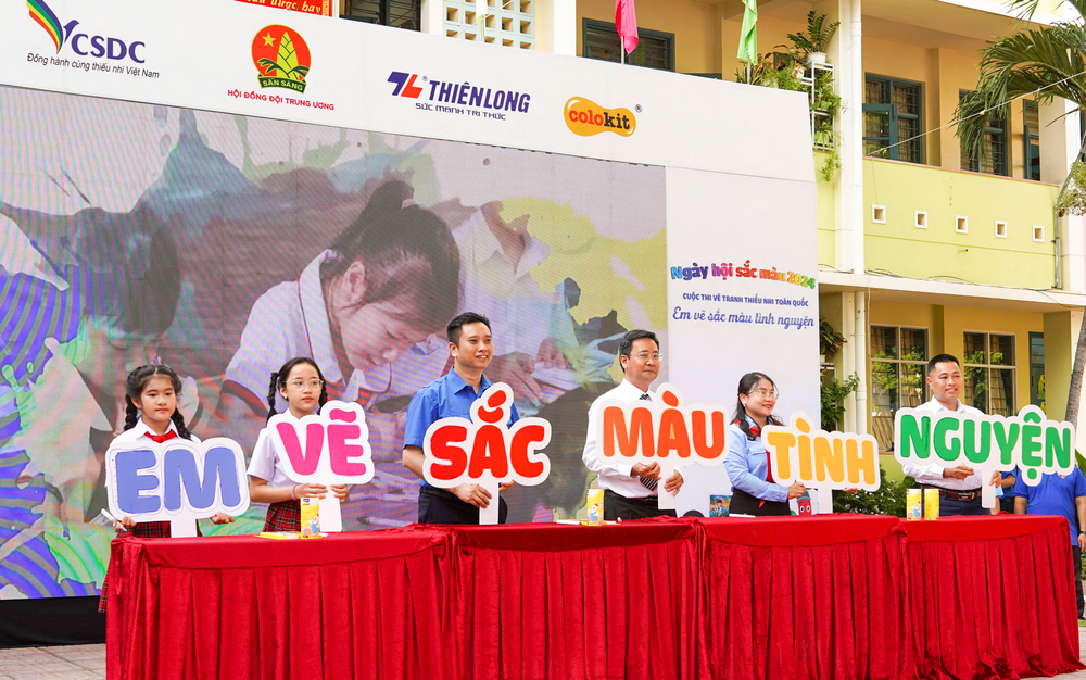 ĐTN: Sáng ngày 6/5, tại trường Tiểu học Phước Tiến, TP Nha Trang, tỉnh Khánh Hòa, Hội đồng Đội T.Ư phối hợp với Công ty Cổ phần Tập đoàn Thiên Long - Nhãn hàng dụng cụ Mỹ thuật Colokit tổ chức phát động “Ngày hội sắc màu” năm 2024 - Cuộc thi vẽ tranh với chủ đề “Em vẽ sắc màu tình nguyện” trong đội viên, thiếu niên và nhi đồng cả nước.