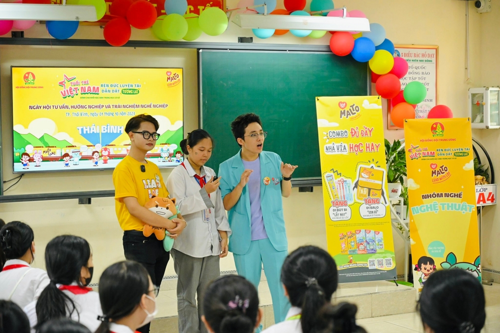 ĐTN: Ngày 01/10, tại Trường THCS Trần Phú (TP Thái Bình), Hội đồng Đội Trung ương phối hợp với Hội đồng Đội tỉnh Thái Bình, Công ty Cổ phần Sữa Quốc tế IDP - Thương hiệu Lof Malto tổ chức ngày hội tư vấn, hướng nghiệp và trải nghiệm nghề nghiệp cho các em học sinh Khối Trung học cơ sở trên địa bàn thành phố Thái Bình.