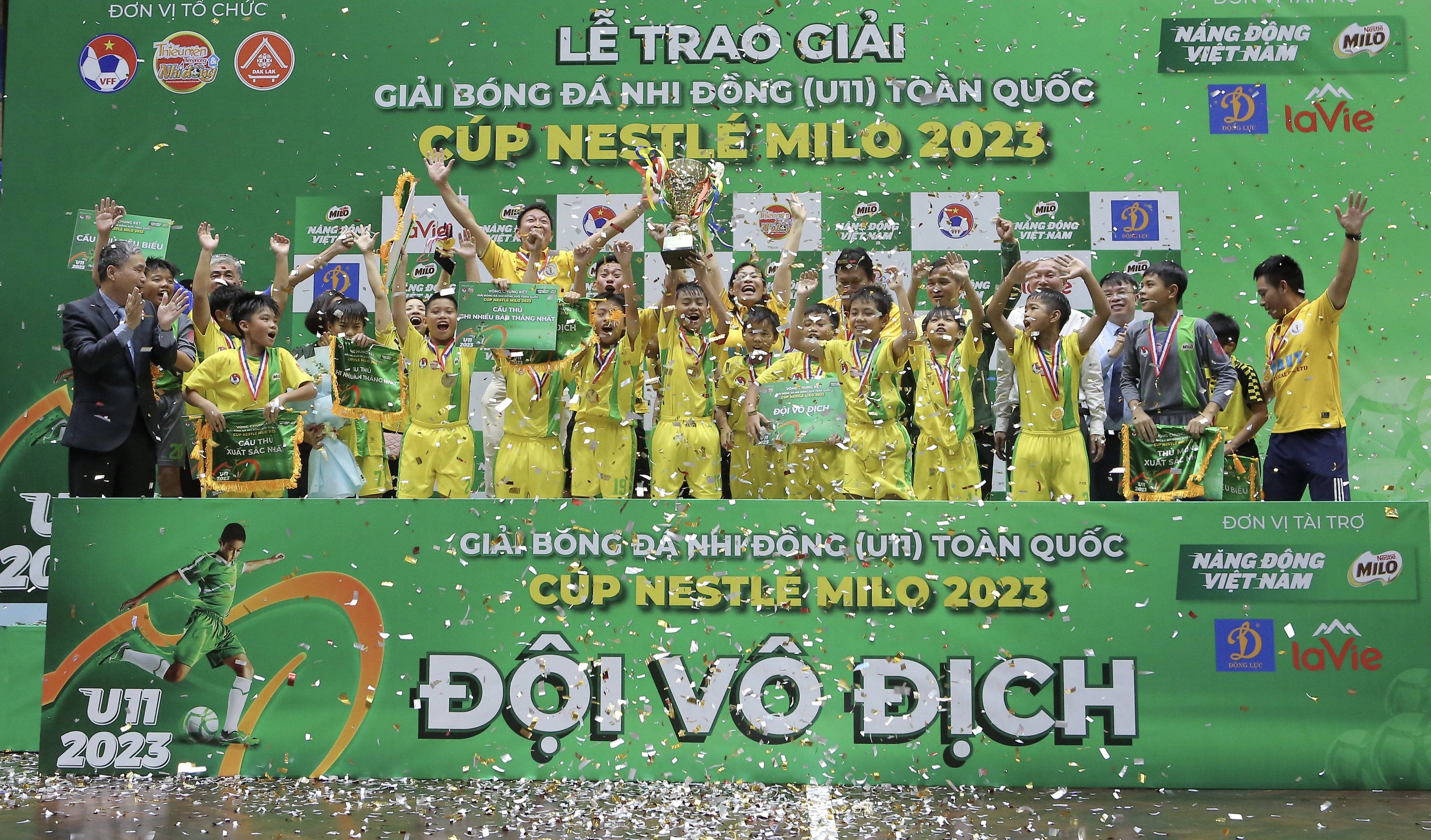 ĐTN: Chiều 05/8 tại nhà thi đấu thể thao tỉnh Đắk Lắk đã diễn ra lễ bế mạc và trận chung kết Giải Bóng đá Nhi đồng (U11) toàn quốc Cúp Nestlé MILO 2023. Tại trận chung kết, đội U11 Navy Phú Nhuận đã xuất sắc vượt qua U11 Hưng Yên để giành cúp vô địch.