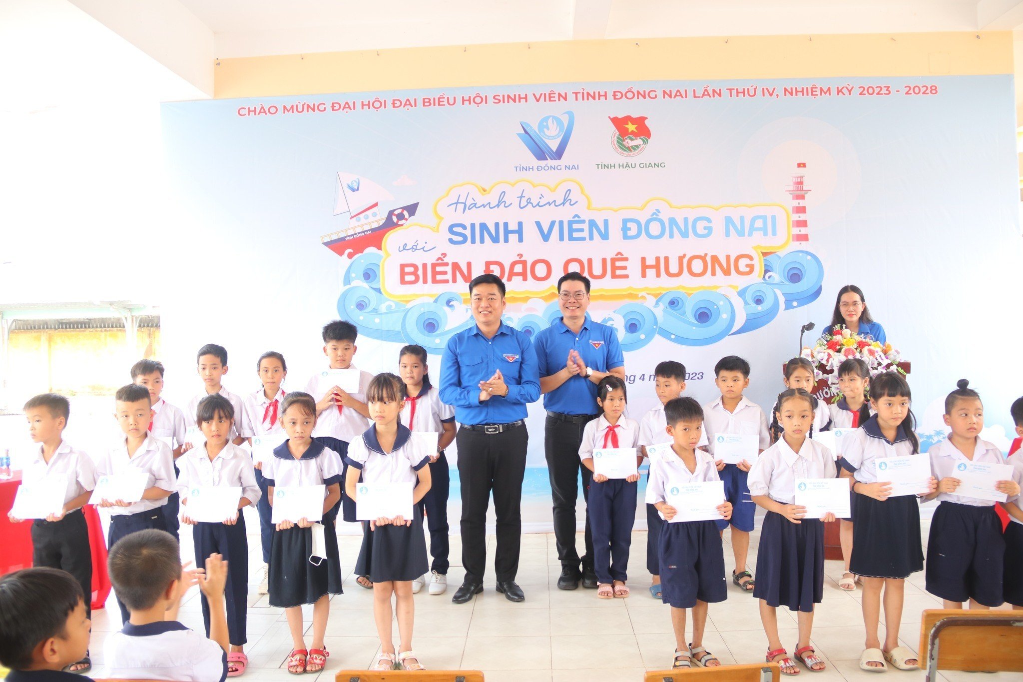ĐTN: Chiều ngày 01/4, tại trường Tiểu học Lái hiếu, thành phố Ngã Bảy, tỉnh Hậu Giang, Ban Thường vụ Tỉnh đoàn Hậu Giang phối hợp với Ban Thư ký Hội Sinh viên tỉnh Đồng Nai tổ chức Chương trình trao học bổng và dụng cụ học tập, tủ sách “Ươm mầm tri thức” và khu vui chơi cho thiếu nhi trên địa bàn thành phố Ngã Bảy.