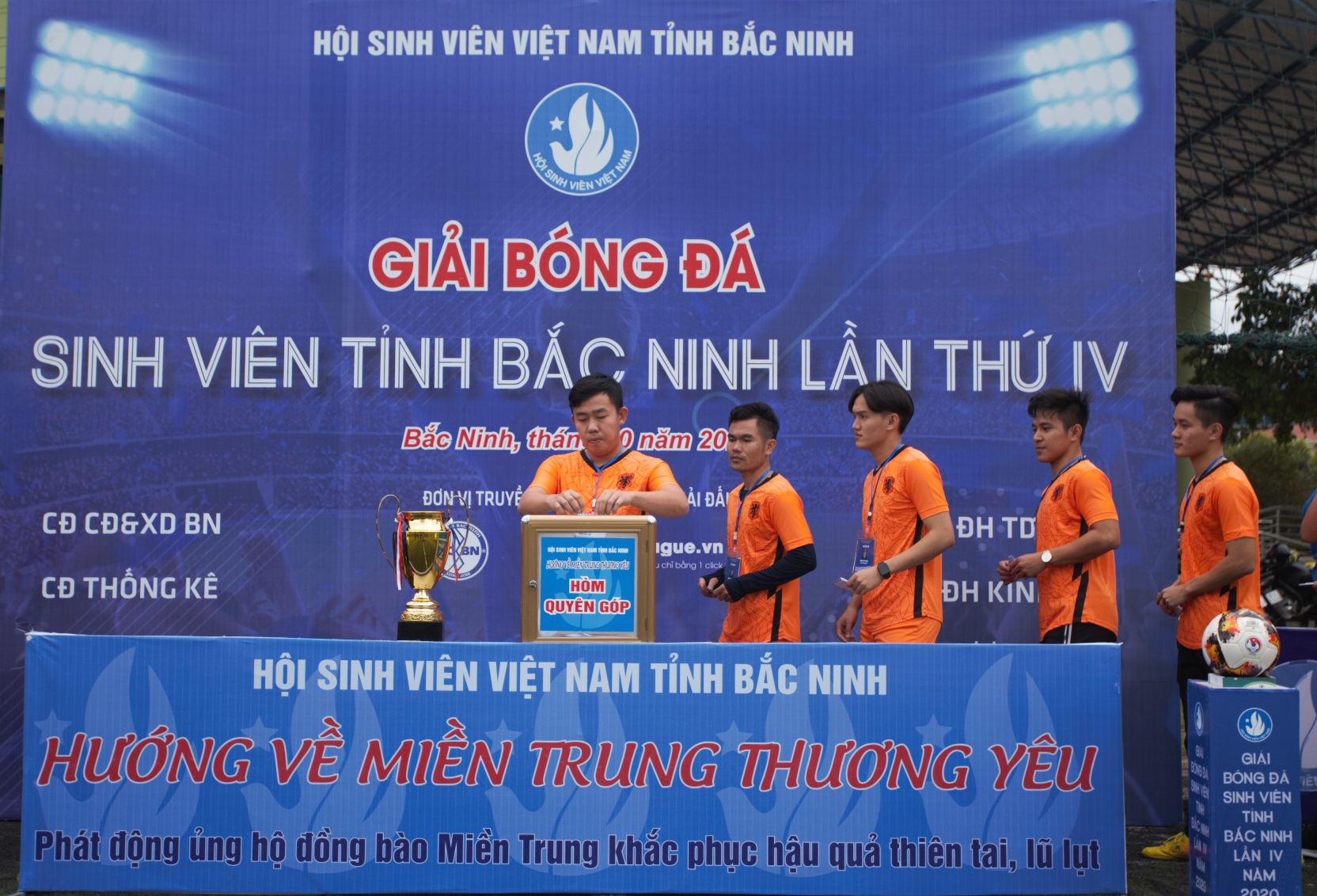 Web.ĐTN: Chiều 28/10, tại lễ bế mạc giải bóng đá Sinh viên tỉnh Bắc Ninh lần thứ IV năm 2020, đồng chí Trần Văn Đăng - Phó Bí thư Tỉnh Đoàn, Chủ tịch Hội Sinh viên tỉnh Bắc Ninh đã tiếp nhận các nguồn lực ủng hộ từ Đoàn TN, Hội Sinh viên các trường Đại học, Cao đẳng, các doanh nghiệp, tổ chức, cá nhân trong tỉnh ủng hộ đồng bào miền Trung.