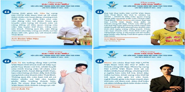 Hướng tới Đại hội đại biểu Hội LHTN Việt Nam tỉnh Thái Bình lần thứ V, nhiệm kỳ 2024 - 2029, Nguyễn Thu Hoài – Hoa khôi bóng chuyền CLB Vietinbank, các cầu thủ bóng đá Đoàn Văn Hậu và Minh Vương, ca sĩ Mono, ca sĩ Anh Tú... cùng gửi gắm tâm tư, kỳ vọng tới Đại hội.