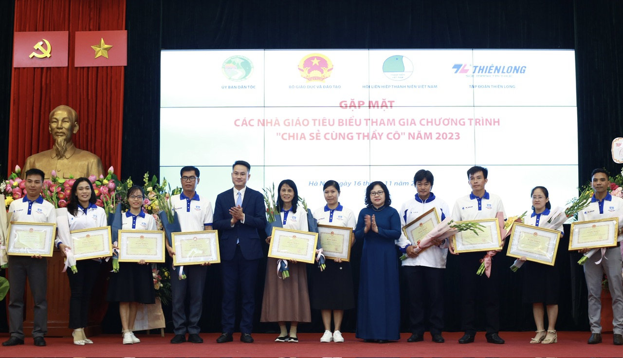 ĐTN: Sáng nay 17/11, tại Hà Nội, Ủy ban Dân tộc (UBDT) đã tổ chức gặp mặt 58 thầy giáo, cô giáo được tuyên dương trong Chương trình “Chia sẻ cùng thầy cô” năm 2023. Đây là hoạt động Trung ương Hội LHTN Việt Nam, Uỷ ban Dân tộc, Bộ Giáo dục và Đào tạo, Tập đoàn Thiên Long phối hợp tổ chức