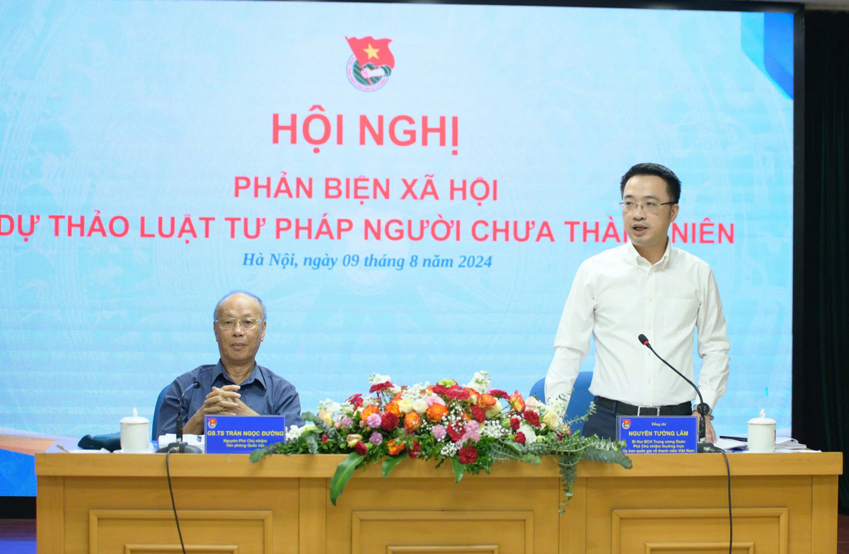 ĐTN: Sáng 9/8, tại Hà Nội, T.Ư Đoàn đã tổ chức Hội nghị phản biện xã hội dự thảo Luật tư pháp người chưa thành niên. Đồng chí Nguyễn Tường Lâm - Bí thư T.Ư Đoàn, Phó Chủ nhiệm thường trực UBQG về Thanh niên Việt Nam và GS.TS Trần Ngọc Đường, Chủ nhiệm Hội đồng Tư vấn Dân chủ và Pháp luật, UBTƯ MTTQ Việt Nam, nguyên Phó Chủ nhiệm Văn phòng Quốc hội chủ trì Hội nghị.