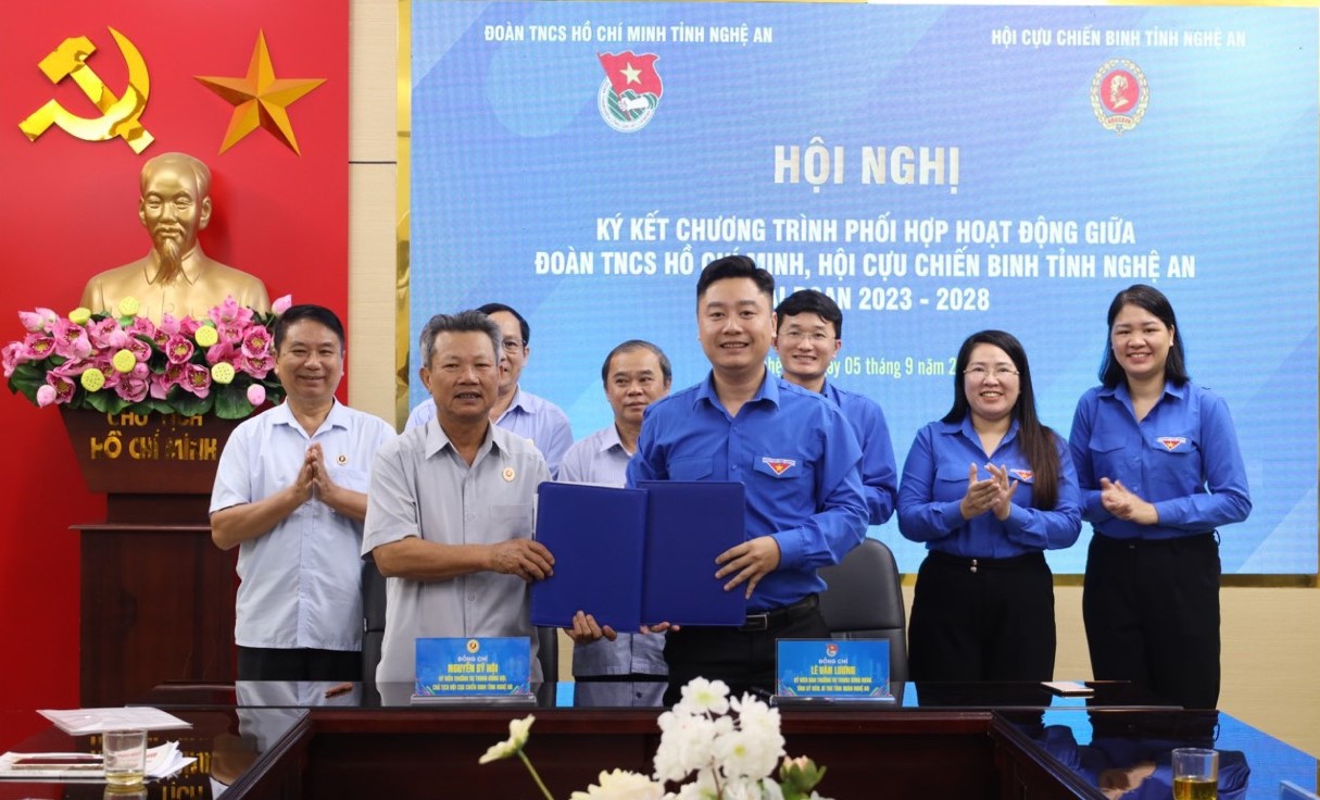 ĐTN: Trong giai đoạn 2023 - 2028, Đoàn TNCS Hồ Chí Minh và Hội Cựu chiến binh tỉnh Nghệ An tiếp tục phối hợp chặt chẽ trong công tác giáo dục chính trị, tư tưởng, lòng yêu nước, tinh thần tự hào dân tộc, chủ quyền biển đảo cho đoàn viên, thanh niên; từ đó phát huy vai trò xung kích của tuổi trẻ trong xây dựng và bảo vệ Tổ quốc.