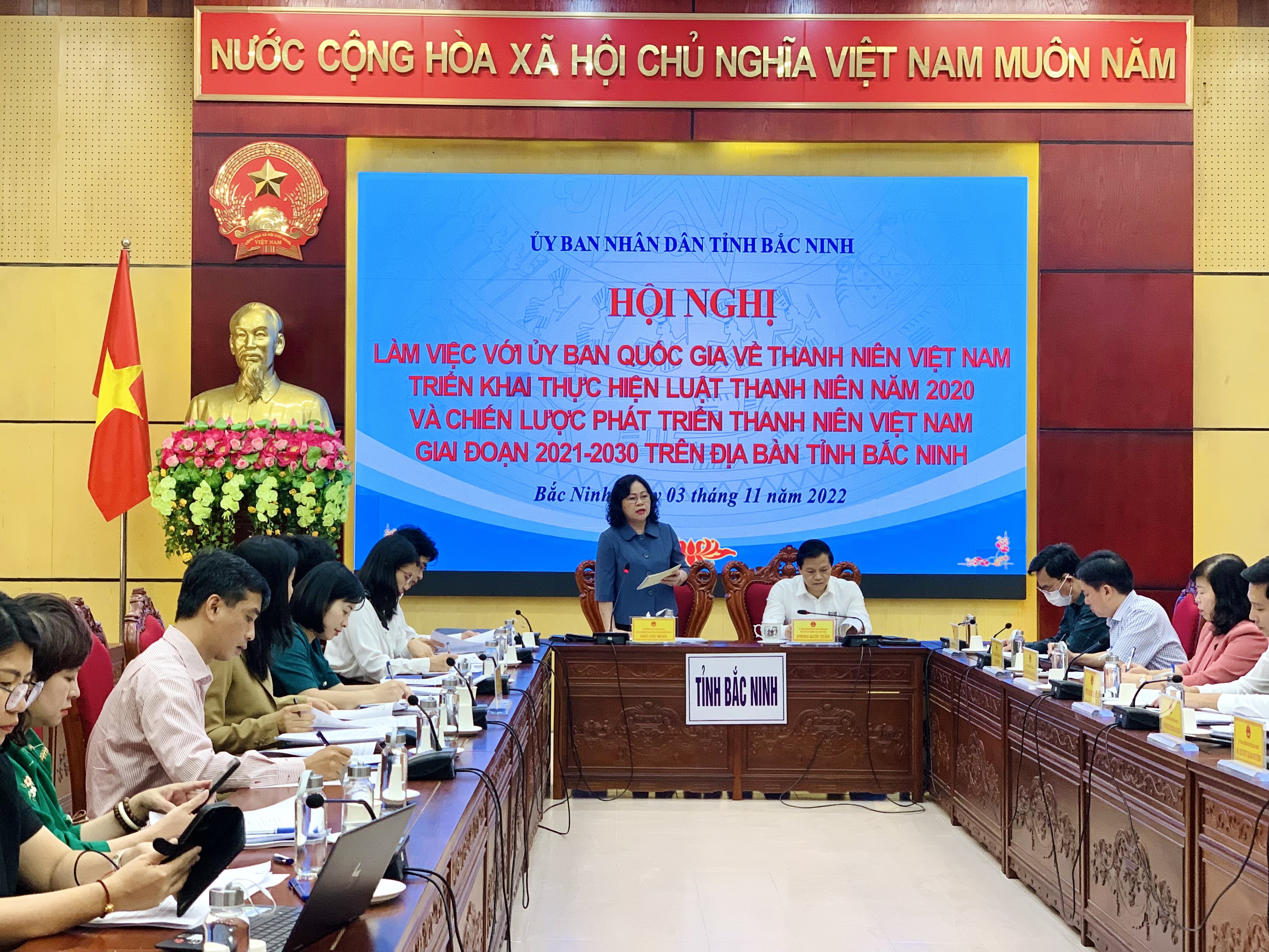 ĐTN: Sáng 3/11, Thứ trưởng Bộ Giáo dục Đào tạo, Phó Chủ nhiệm UBQG về thanh niên Việt Nam Ngô Thị Minh dẫn đầu đoàn công tác đã có buổi làm việc với Ủy ban nhân dân tỉnh Bắc Ninh về việc triển khai thực hiện Luật Thanh niên năm 2020 và Chiến lược phát triển thanh niên Việt Nam giai đoạn 2021- 2030.