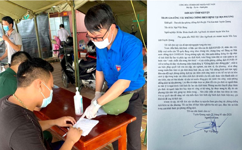 ĐTN: Trước diễn biến phức tạp của dịch bệnh Covid-19, anh Ngô Việt Hưng, Bí thư chi đoàn Ngân hàng Nông nghiệp chi nhánh huyện Yên Sơn, tỉnh Tuyên Quang đã không ngần ngại viết đơn tình nguyện đăng ký tham gia chống dịch tại địa phương.