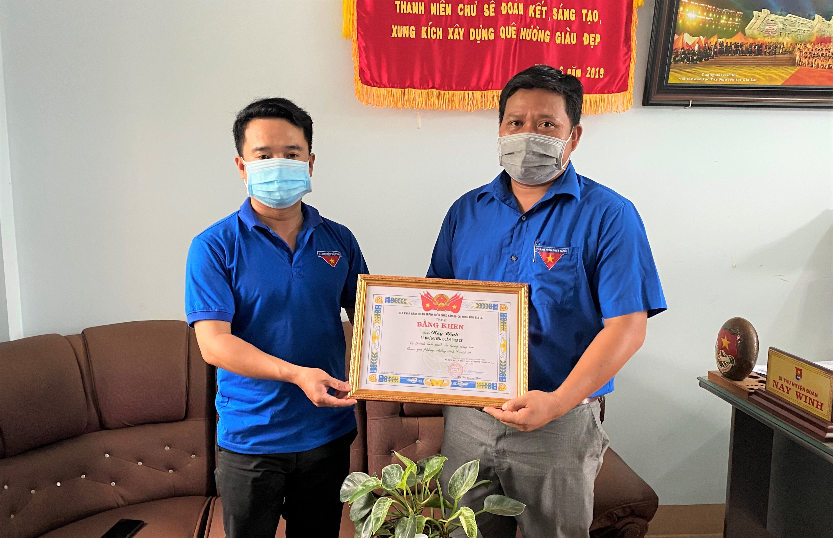ĐTN: Chiều 25/6, tại huyện đoàn Chư Sê, anh Đỗ Duy Nam, Phó Bí thư Tỉnh đoàn Gia Lai đã đến tặng bằng khen của Ban Chấp hành Tỉnh đoàn cho anh Nay Winh, Bí thư Huyện đoàn Chư Sê vì đã có thành tích xuất sắc trong công tác chỉ đạo và huy động nguồn lực chống dịch Covid.